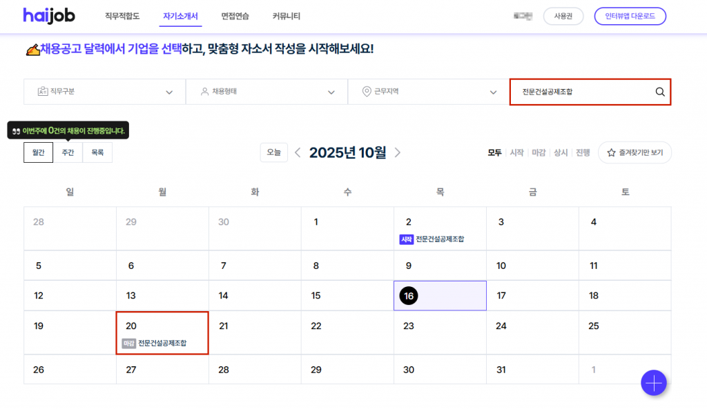 2️⃣'자기소개서 > 실시간 채용공고' 메뉴의 채용공고 달력에서 '전문건설공제조합(10/20)' 클릭 (▶전문건설공제조합 자소서 쓰기)