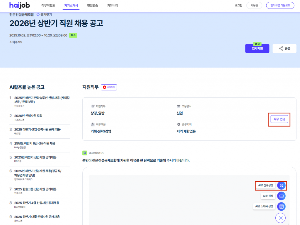 하이잡으로 전문건설공제조합 자소서 초안을 빠르게 잡고,
